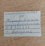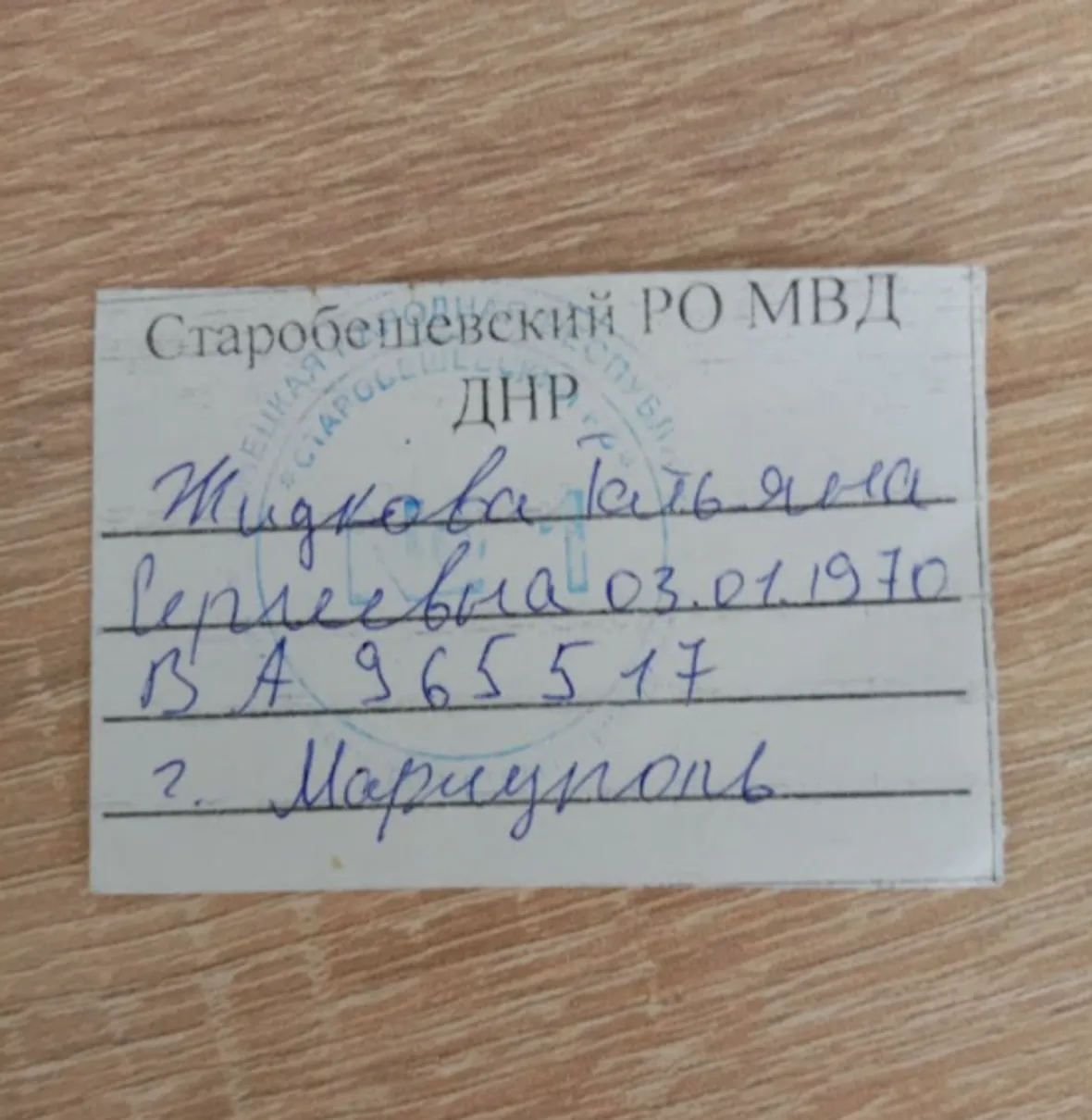 Далі — кадирівці, вони всіх людей зібрали й допомогли спуститися з гірки в Ляпіно. Там стояв блокпост. Жінок не чіпали, а хлопців роздягалися до поясу, та дивилися, чи є сліди від прикладів та татуювання. Автобус нас привіз в Роздольне, ночували в школі, звідти на ранок відправили в Старобєшево, й там ми пробули майже два дні. Всіх почали переписувати, щоб ми пройшли фільтрацію. Зібрали в залі палацу культури й по прізвищах викликали за списком. В нас захворів Максимка — стоматит, температура, ми не могли довго чекати. Юля підійшла й попросила провести фільтрацію швидше. Нам сказали йти в поліцію, бо списки туди потім принесуть. Ми пішли, заповнили якусь анкету: писали — де працювали, ким працювали, нас фотографували, у мене навіть зберігся клаптик паперу, що я пройшла фільтрацію. Сховала, думаю, хай для історії буде.